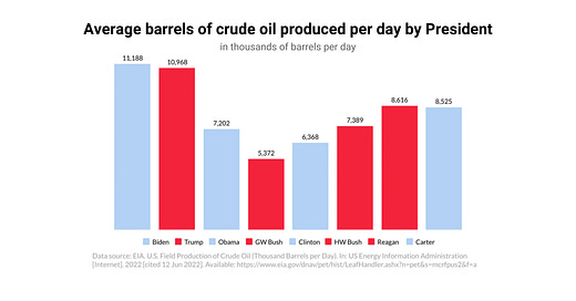 Production has not meaningfully changed between the current and the former President, but still, we see an all-time high price of $5/gal (Sanicola, 2022).